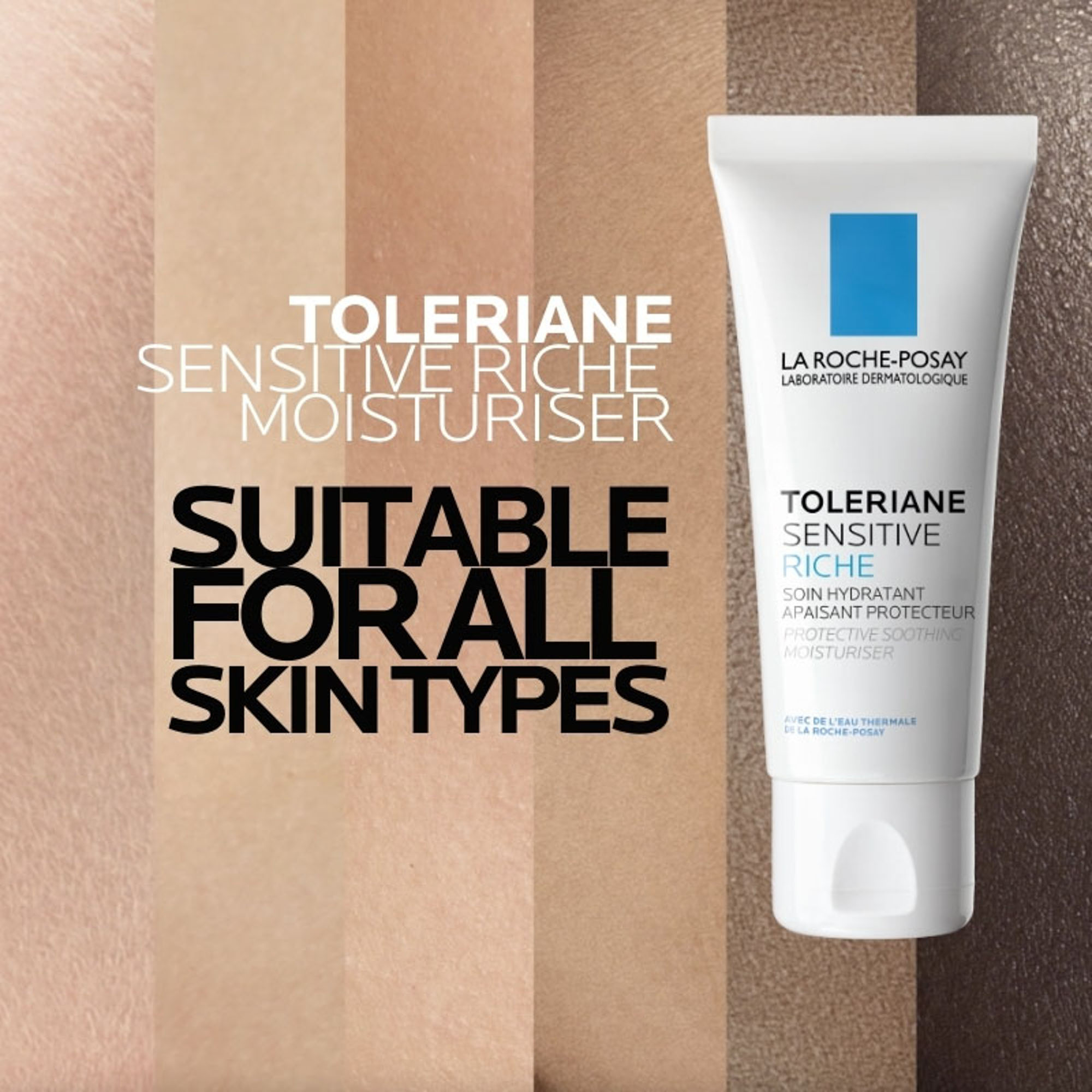 Toleriane Sensitive Riche Facial Cream 40mL is a soothing protective cream - a hydrating prebiotic moisturiser for sensitive skin, dry skin prone to irritation. It helps to hydrate, protect and soothe skin. It is suitable even for children & babies delicate skin. Enriched with La Roche-Posay Thermal Spring Water, Toleriane Sensitive Riche facial moisturiser features an extra-hydrating, rich texture for sensitive skin. For sensitive and intolerant skin, Toleriane Sensitive Creme is a minimal formula to protect the skin like Toleriane Riche, but with a lighter texture. Key Ingredients - SHEA BUTTER: Repairs and protects the skin barrier. - LA ROCHE-POSAY THERMAL WATER: Calms skin. Reduces redness and irritation. - GLYCERIN: Provides intense 48-hour hydration. Ingredients: AQUA / WATER • ISOCETYL STEARATE • COCO-CAPRYLATE/CAPRATE • SQUALANE • BUTYROSPERMUM PARKII BUTTER / SHEA BUTTER • GLYCERIN • PROPANEDIOL • CETYL ALCOHOL • ALUMINUM STARCH OCTENYLSUCCINATE • GLYCERYL STEARATE • PENTYLENE GLYCOL • PEG-100 STEARATE • NIACINAMIDE • CETEARYL ALCOHOL • SODIUM HYDROXIDE • CAPRYLYL GLYCOL • CITRIC ACID • ACRYLATES/C10-30 ALKYL ACRYLATE CROSSPOLYMER (B5144/7) Please be aware that ingredient lists for the products of our brand are updated regularly. Please refer to the ingredient list on your product package for the most up to date list of ingredients to ensure it is suitable to your personal use.