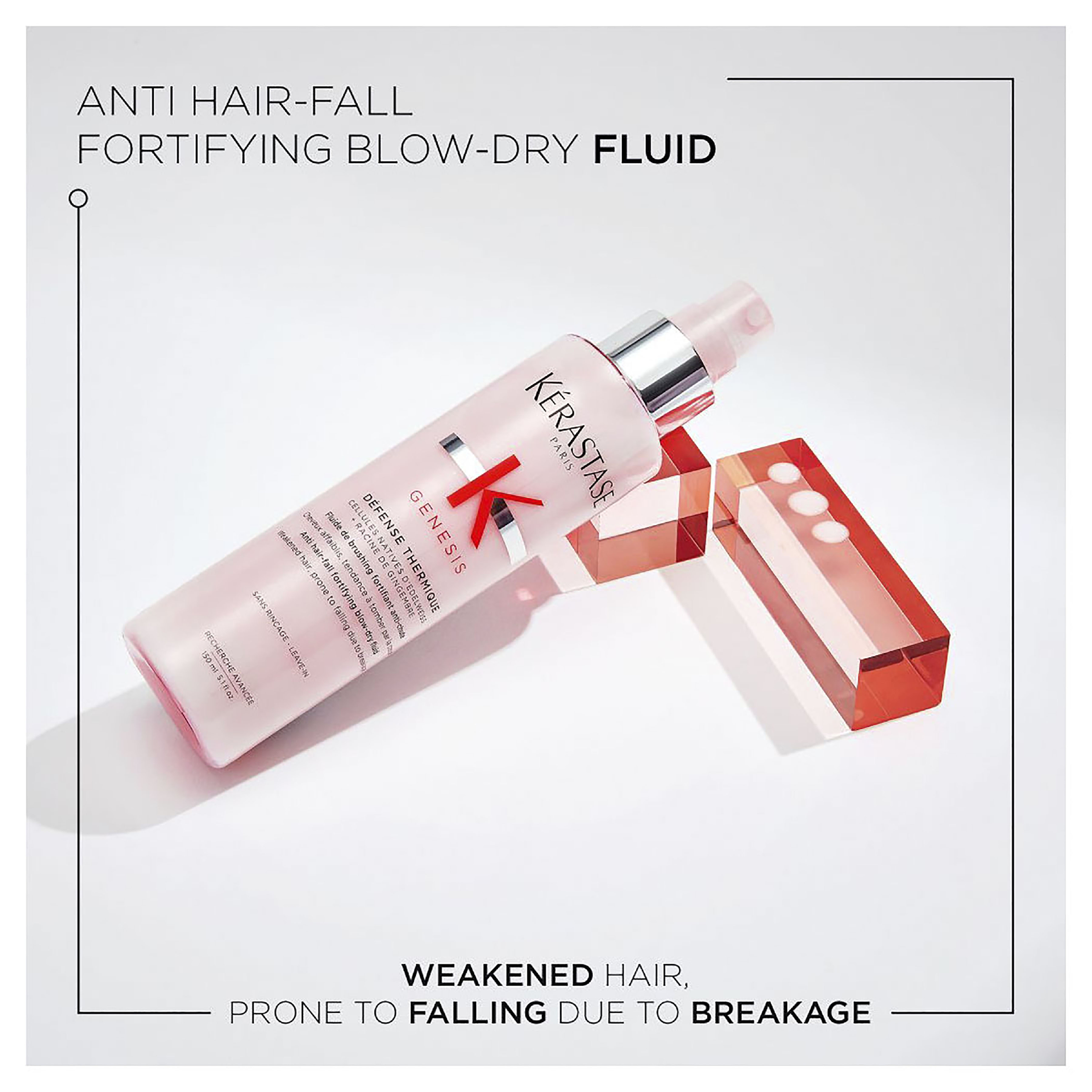 Anti Hair-fall Fortifying blow-dry fluid for weakened hair, prone to falling due to breakage. Provides anti-breakage action and heat protection up to 220°C. Ensures optimal hydration without frizz.