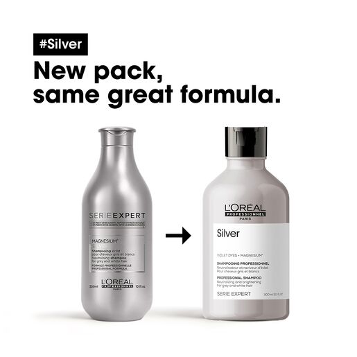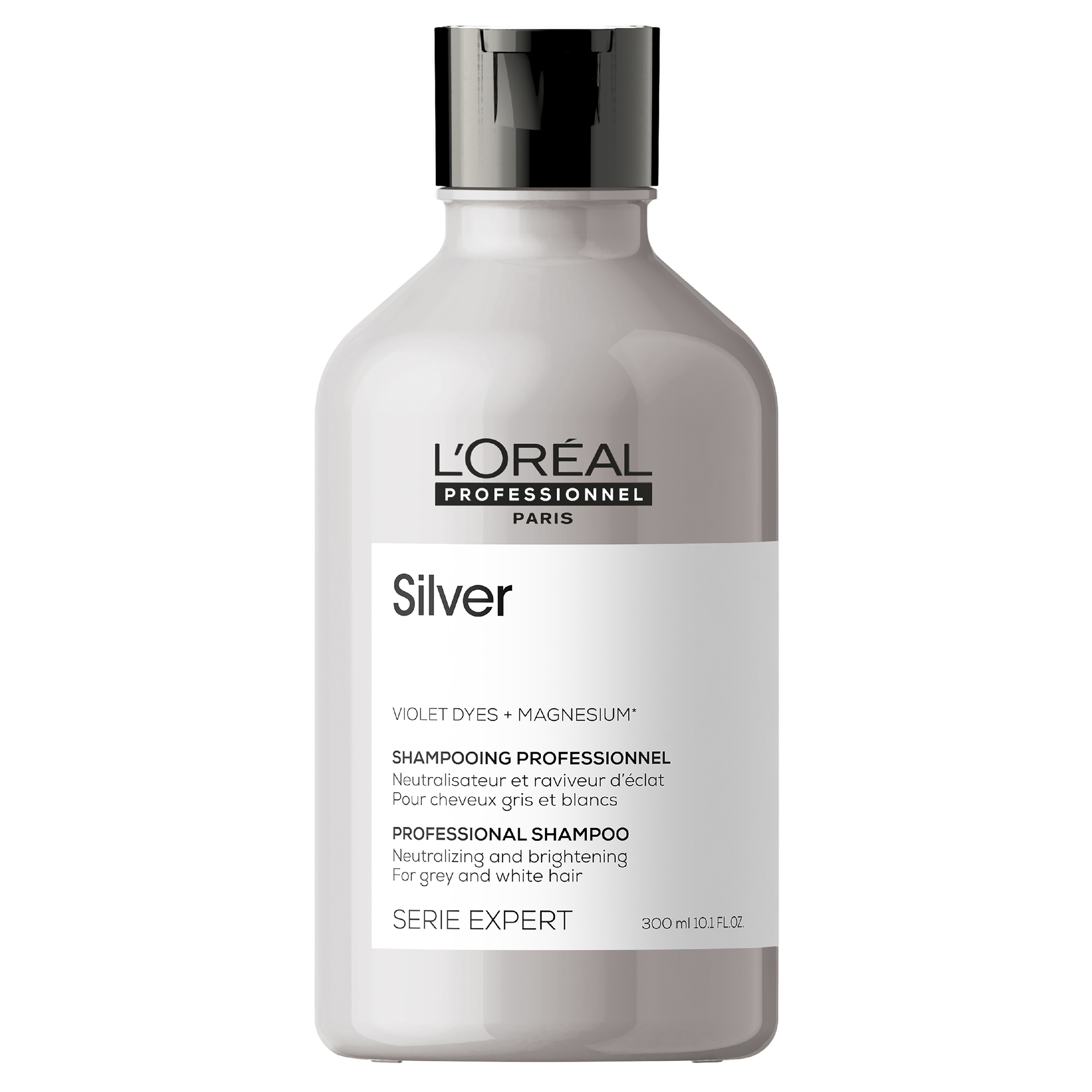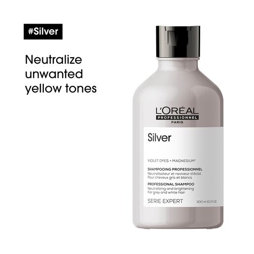 L'Oréal Professionnel's Silver Shampoo is a neutralizing system. This innovative deep purple shampoo uses magnesium and anti-yellowing agents to help counteract unwanted brassy tones of pre-lightened, tinted or highlighted hair whilst deeply softening each strand from root-to-tip. The shampoo delivers toning results while nourishing and protecting the hair fiber and boosting shine. Give this one a go if you have grey, white, metallic or platinum blonde hair and want to keep the brassy tones at bay. For grey and white hair types. Size: 300ml Fragrance: N/A KEY FEATURES • Neutralizing • Deep purple colour • Powered by Magnesium • Contains anti-yellowing agents • Counteracts brassy tones in hair • Softens hair from root to tip • Nourishes and boosts shine • Protects hair fiber