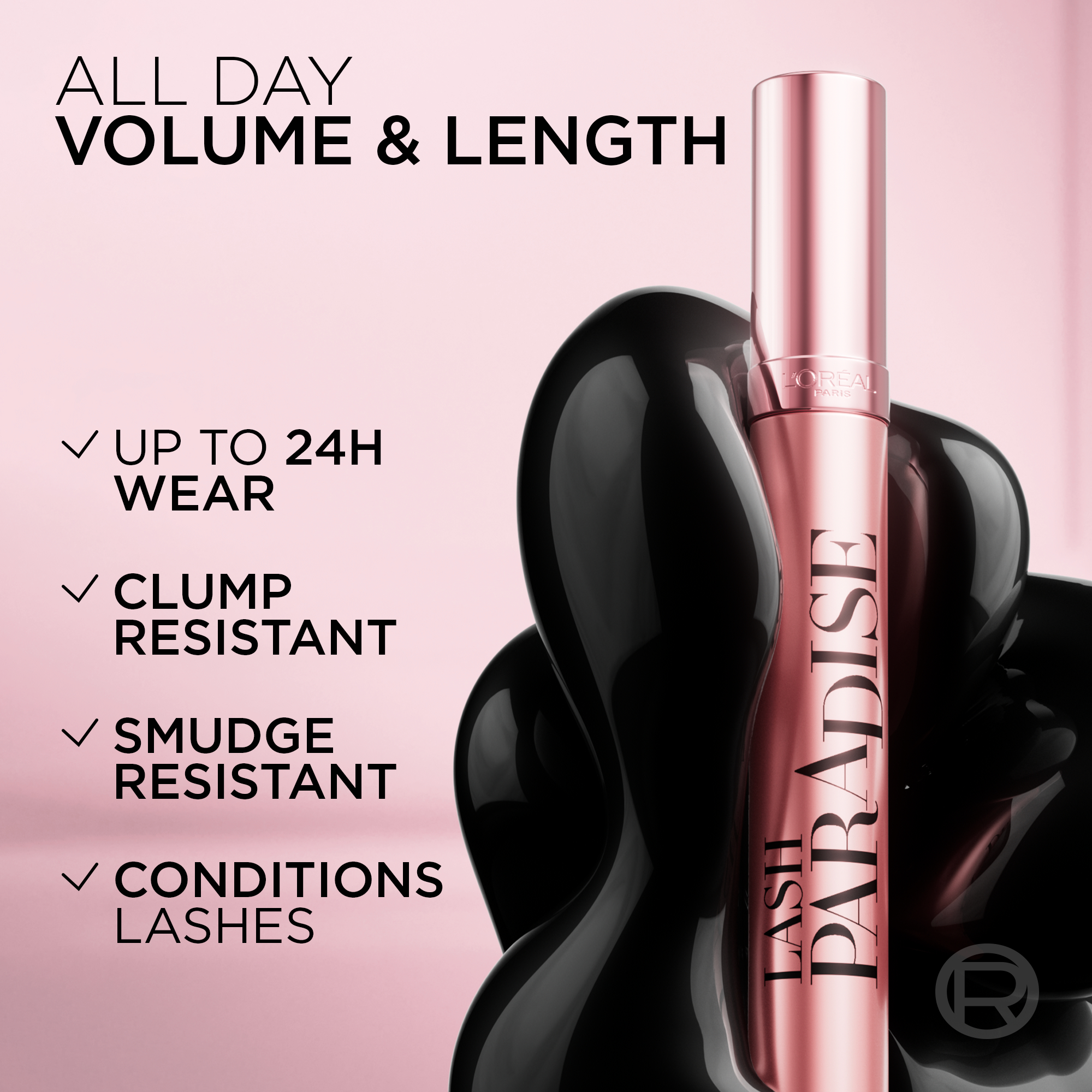 Take your lashes to paradise with the improved, more natural formula of Lash Paradise mascara by L'Oreal Paris. Achieve breathtaking volume with a formula enriched with Floral Oil to condition lashes. Delivers intense volume and spectacular lash length with the most pleasurable application experience. 20x more volume*, up to 2x more length* The whipped volumizing formula creates intense lash volume and dramatic length Caring oil infused formula for soft, supple lashes without any flaking or clumping. The feather-soft wavy brush gentle applicator for extreme comfort around sensitive eye areas. Ophthalmologist tested. Free from Parabens & Alcohol and suitable for sensitive eyes. *Instrumental test, 24 subjects