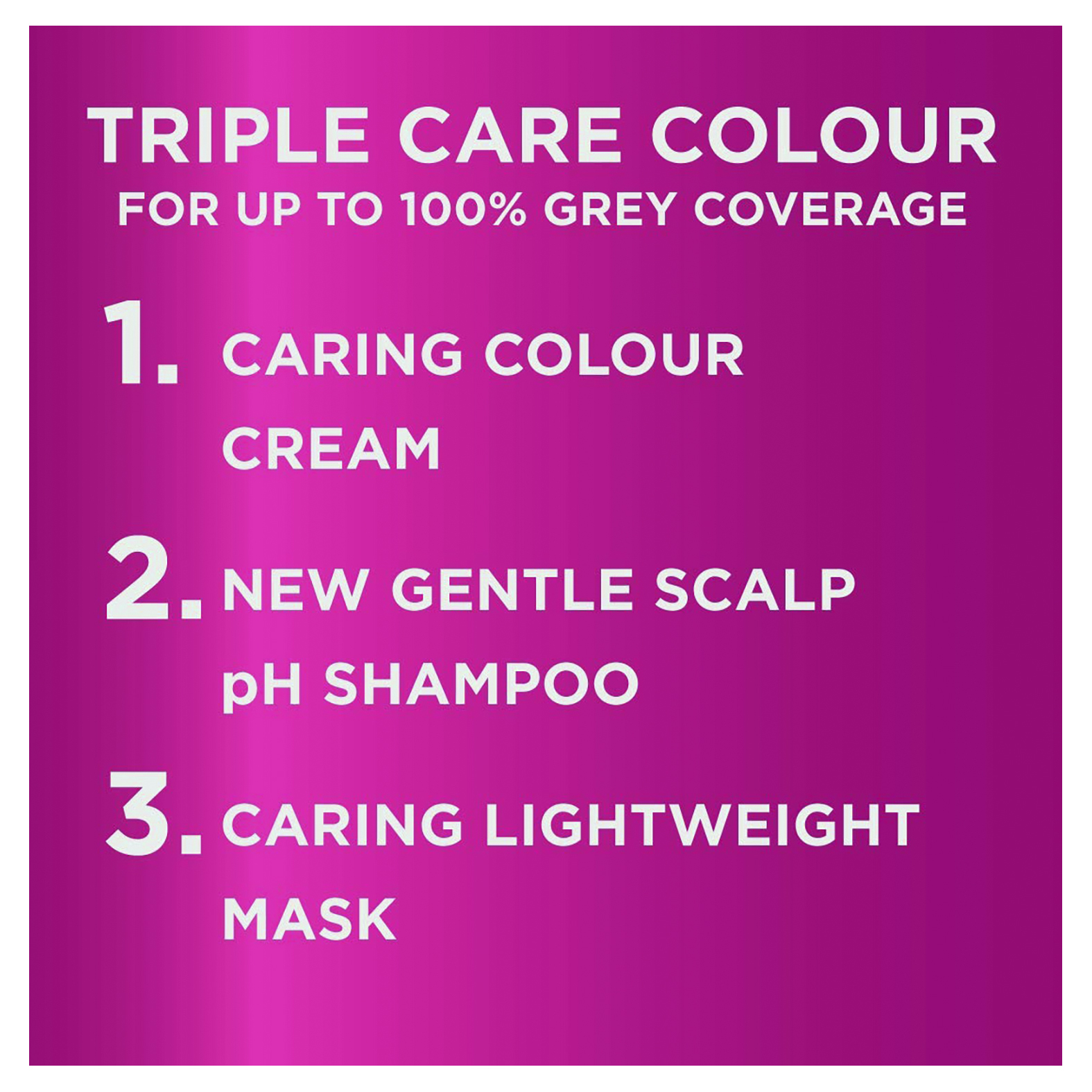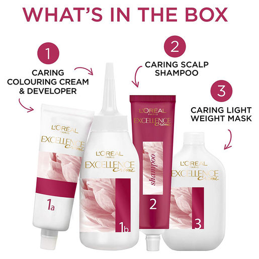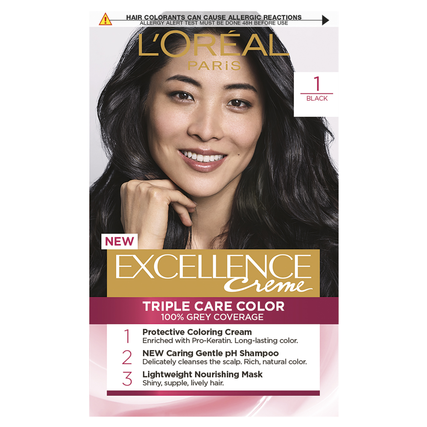 Experience visibly better hair quality than before colouring* with Excellence Creme by L'Oréal Paris, now enriched with hyaluronic acid. Our kit provides 100% grey coverage, giving your hair up to 10x more moisture* and 2x richer colour**. The application is easy thanks to our non-drip crème formula, suitable for all hair types. Our Triple Care Colour ritual cares for your colour, cares for your scalp and cares for your hair. The protective colouring cream is enriched with Pro-Keratin for long lasting colour. The gentle scalp post-colour shampoo delicately cleanses the scalp and hair by gently rinsing away excess residue. Formulated specifically to be used right after colouring your hair. Complete the routine with the caring lightweight mask which is infused with conditioning ingredients, our mask intensively nourishes the hair without weighing it down. *instrumental test after use of the whole kit *instrumental test How To Use: 1) Add the L'Oréal Paris Excellence Crème colouring cream to the developer and shake well to mix. 2) Apply the mix to your hair, starting from the roots then throughout the lengths and ends. Leave in hair for 30 mins. 3) Rinse your hair until the water runs clear. Use the Caring Gentle pH Shampoo to remove any excess residue. 4) Apply a hazelnut amount of the Lightweight Nourishing Mask. Leave in for 3 mins then rinse your hair. Use the mask once a week until your next colour for soft, shiny, lively hair. IMPORTANT - The colour of the mix looks different than before, but hair colour results remains the same as long as it is not rinsed before the 30-minute processing time.