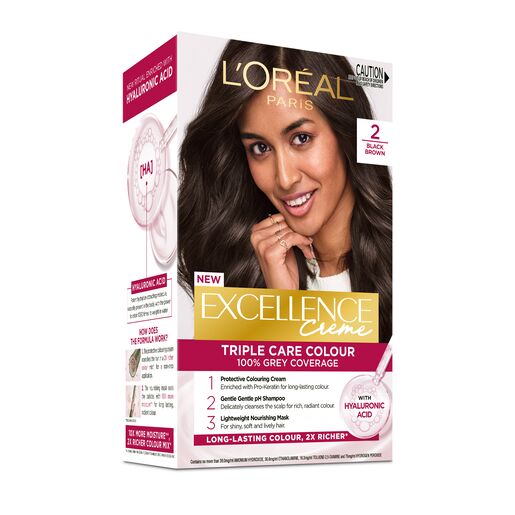 Experience visibly better hair quality than before colouring with Excellence Crème by L'Oréal Paris, now enriched with Hyaluronic Acid. 100% grey coverage from root to tip. L'Oréal Paris Excellence Crème gives you a rich, deep, natural and even colour available in a wide spectrum of shades. Our Triple Care Colour ritual cares for your colour, cares for your scalp and cares for your hair. The protective colouring cream is enriched with Pro-Keratin for long lasting colour. The new caring gentle post-colour shampoo delicately cleanses the scalp and smooths the hair to reveal its radiance. Complete your routine with the new caring lightweight mask that intensively nourishes the hair without weighing it down.