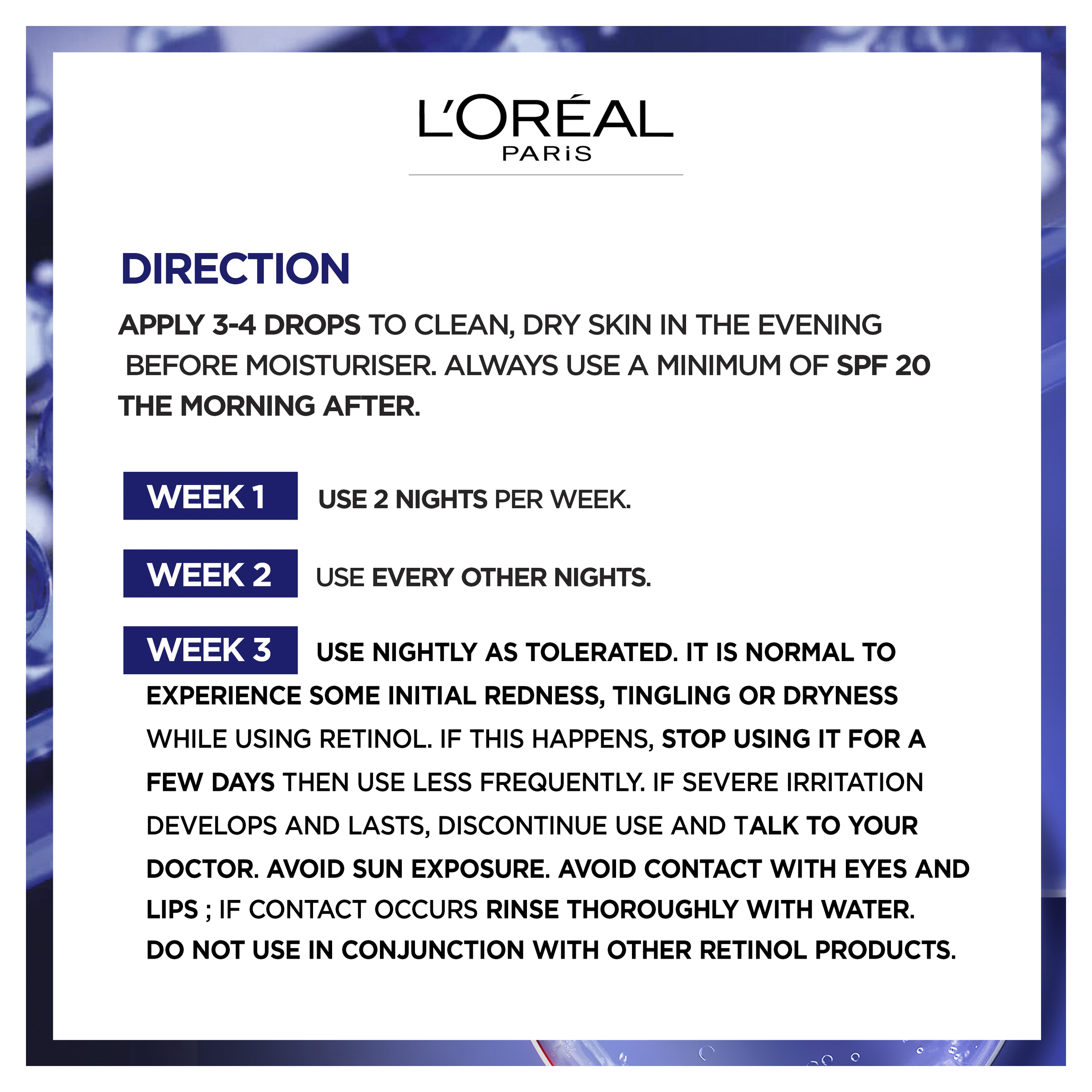 L’Oréal Paris Revitalift Laser Pure Retinol Night Serum is our most potent, highest concentration of pure Retinol. Validated with dermatologists, the powerful formula is scientifically proven to visibly reduce 100% of wrinkles, even deep ones* Known to be highly effective and fast-acting in correcting deep wrinkles and signs of ageing, pure Retinol is a top dermatologist-recommended ingredient which helps to renew skin overnight. It is proven to fight stubborn signs of ageing like deep wrinkles, age spots and uneven skin texture. WHAT IS PURE RETINOL? Dermatologists recommend Pure Retinol because it is the most researched, potent and effective form. With many retinols available in skincare, always look for those that say PURE. 0.2% Pure Retinol is an optimal concentration that has been dermatologist-validated for fast, visible results. WHY CHOSE PURE RETINOL? Not all PURE Retinols are created equally. As an ingredient, Pure Retinol is known to degrade and lose potency when exposed to air and light, causing it to be less effective over time - in fact, many products lose significant Retinol concentration before even opening the bottle. Which is why L’Oreal Paris’s exclusive international patent-pending technology, RETINOL GUARD ™, has been developed to stabilise and protect the Retinol, so it is potent & effective from the first to the very last drop. When using Retinol, remember to always use a facial sunscreen or broad spectrum SPF moisturiser as Retinol sensitises your skin to UV rays. Your skin will need time to get used to this powerful ingredient too, so it is recommended to introduce it gradually and use only at night. *Cosmeto-clinical study on 49 women: scoring of face wrinkles at 4 months.
