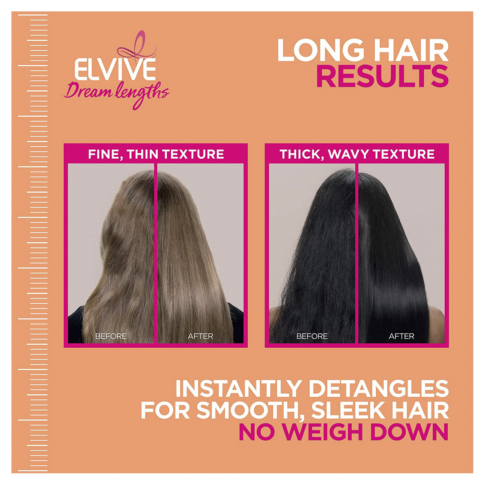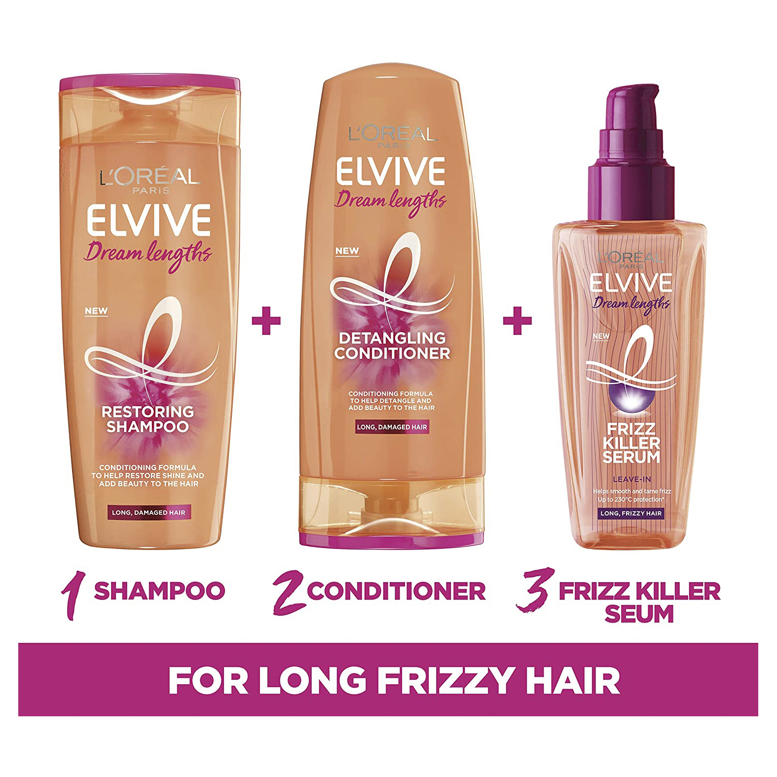 Reinforce your long, frizzy hair with Elvive Dream Lengths Frizz Killer Serum. Enriched with a vegetal keratin and cocoa butter, the leave-in treatment tames frizz and static hair allowing you to achieve your long hair goals.