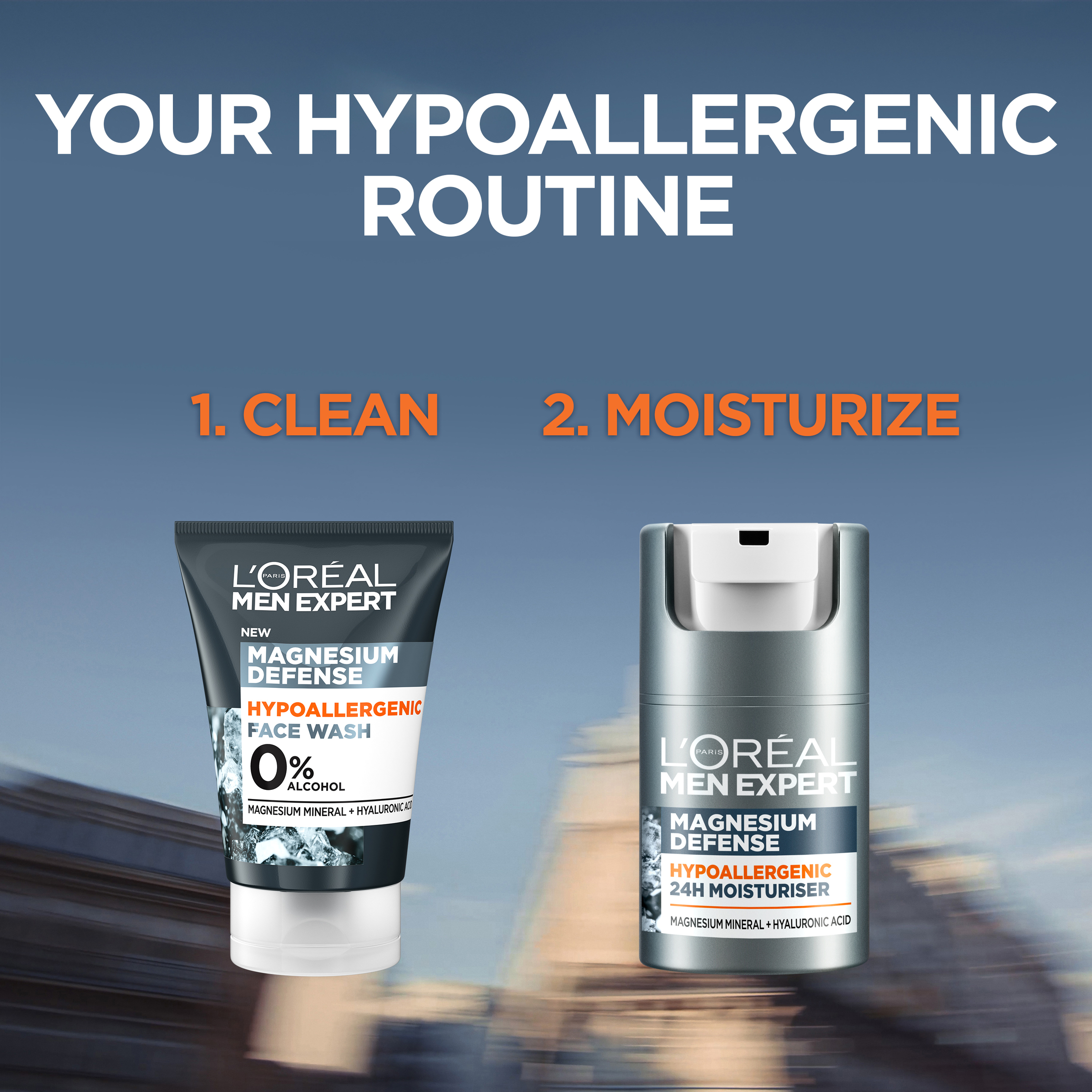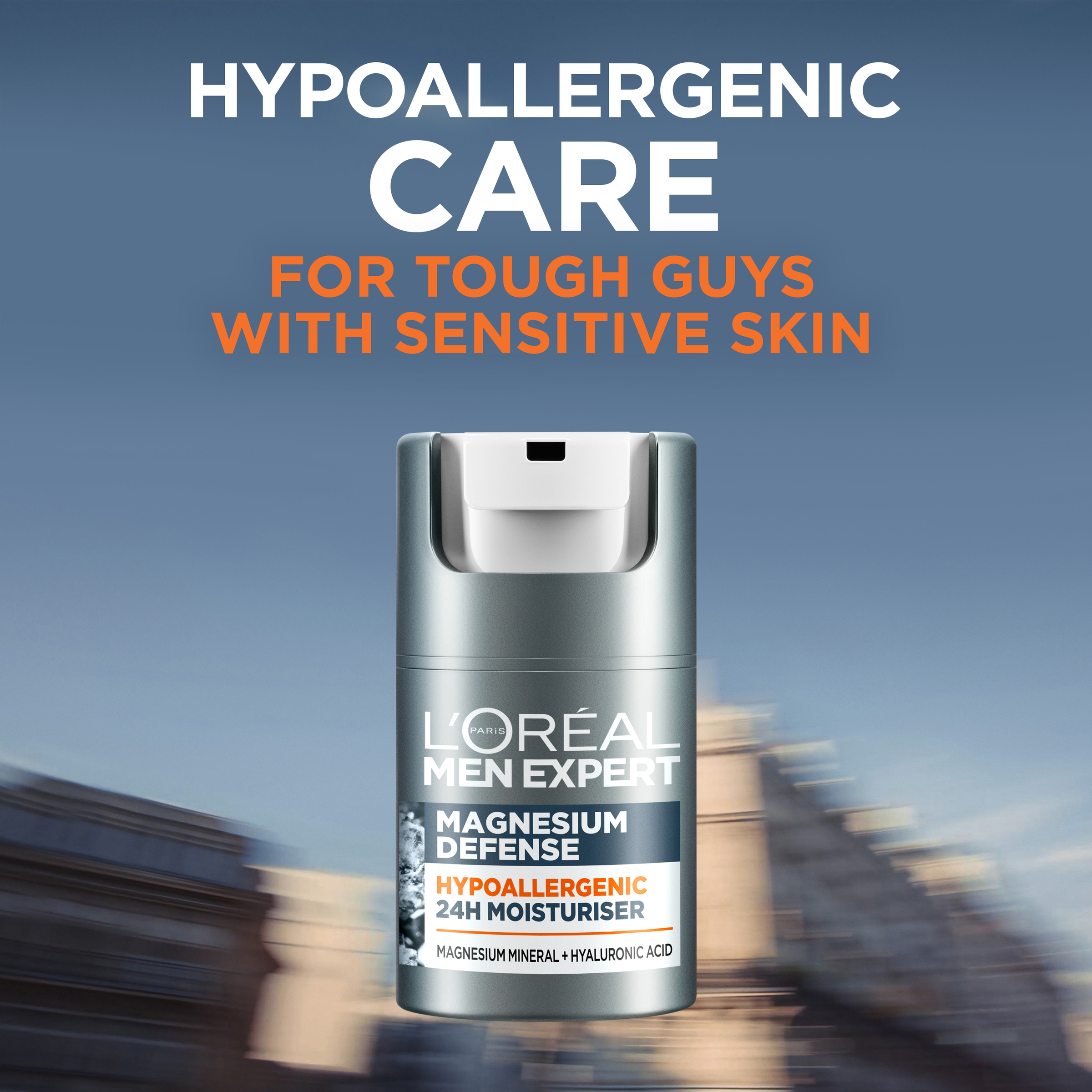 L'Oréal Paris Men Expert Magnesium Defense Moisturiser soothes, protects and strengthens skin from external aggressors for up to 24h. Discover our 24H Moisturiser, specifically designed for men's sensitive skin, fragilized by external aggressors. Enriched with Magnesium Mineral, our formula helps strengthen the protective natural skin barrier function and acts as a reinforcing ally for sensitive skin fragilized by external aggressors. Naturally present in our skin, Hyaluronic Acid is well known for its super-hydrating properties. *0% alcohol = no ethyl alcohol.