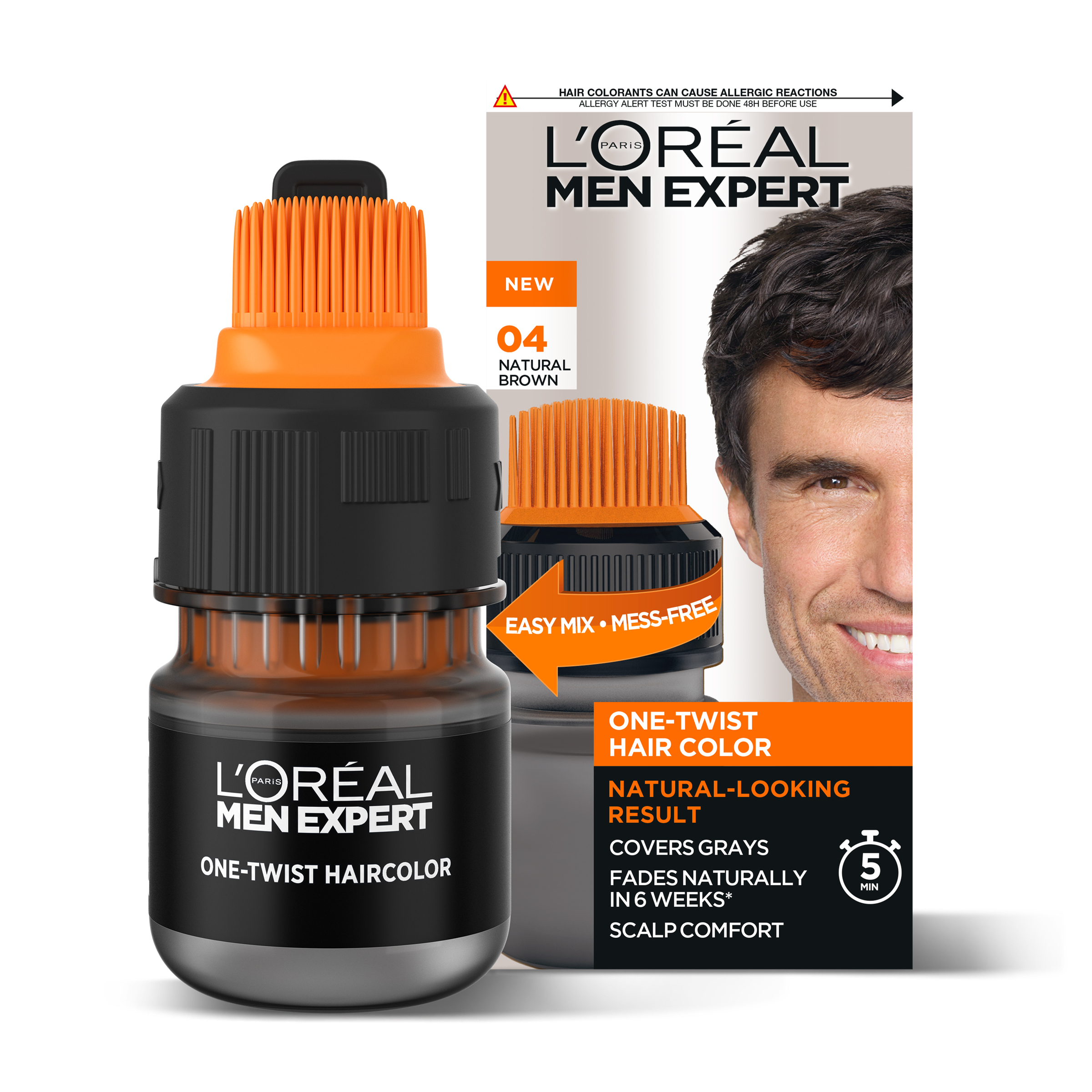 Specially developed for men’s hair, this hair dye covers grey hair in just 5 minutes: easy and mess-free, our innovative ONE-TWIST technology works in just 5 minutes for a natural looking result that perfectly blends with your original hair colour. So natural, that no one will know you coloured your hair.