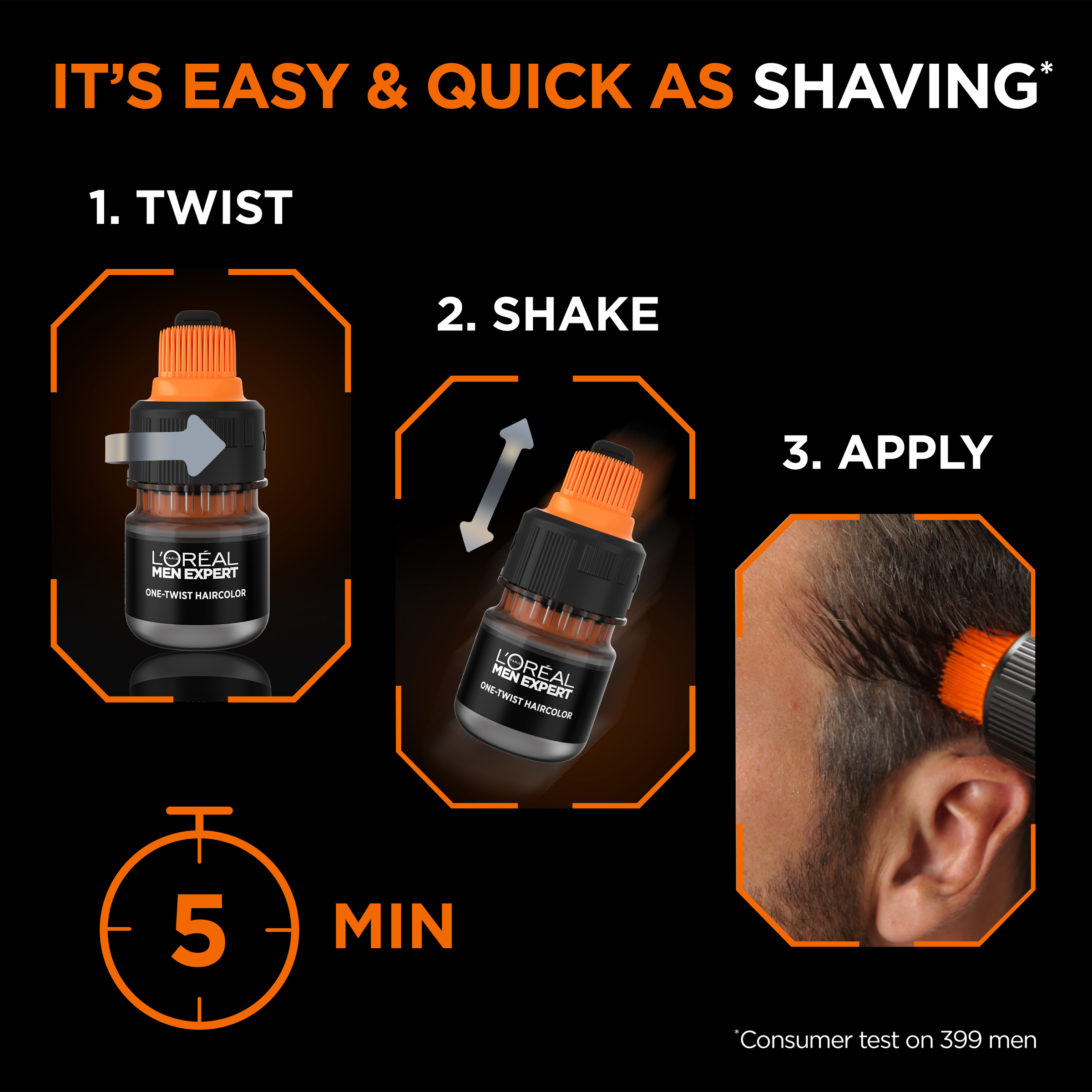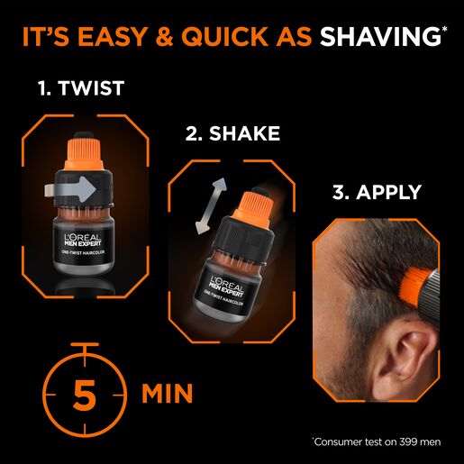 Get a natural looking hair result and cover grey hair in just 5 minutes with the easiest hair colour for men, the L'Oréal Paris Men Expert ONE-TWIST HAIR DYE: easy-mix, mess-free application. Ammonia-free, naturally blended greys.