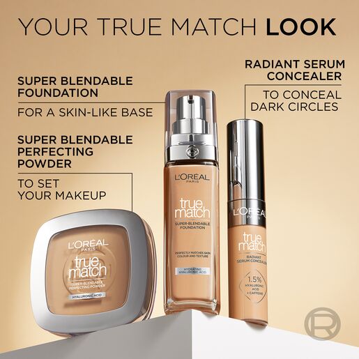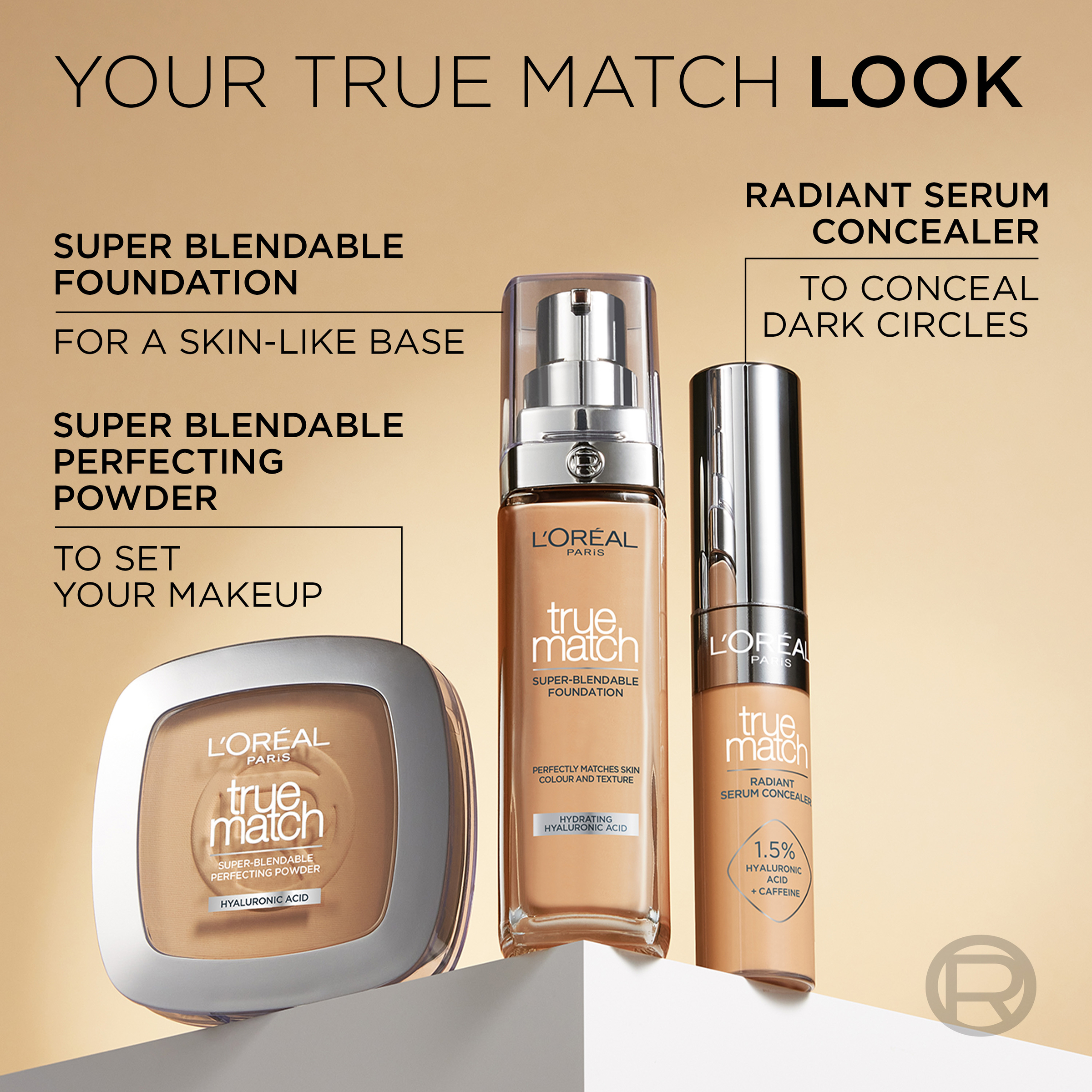Discover the 48 skin matching shades of L'Oréal Paris True Match foundation. A foundation infused skincare ingredients such as Hyaluronic Acid. Now upgraded with new skin matching technology, formulated with up to 6 pigments for our most precise shade match. The skin loving foundation provides a flawless natural coverage with a skin like finish.