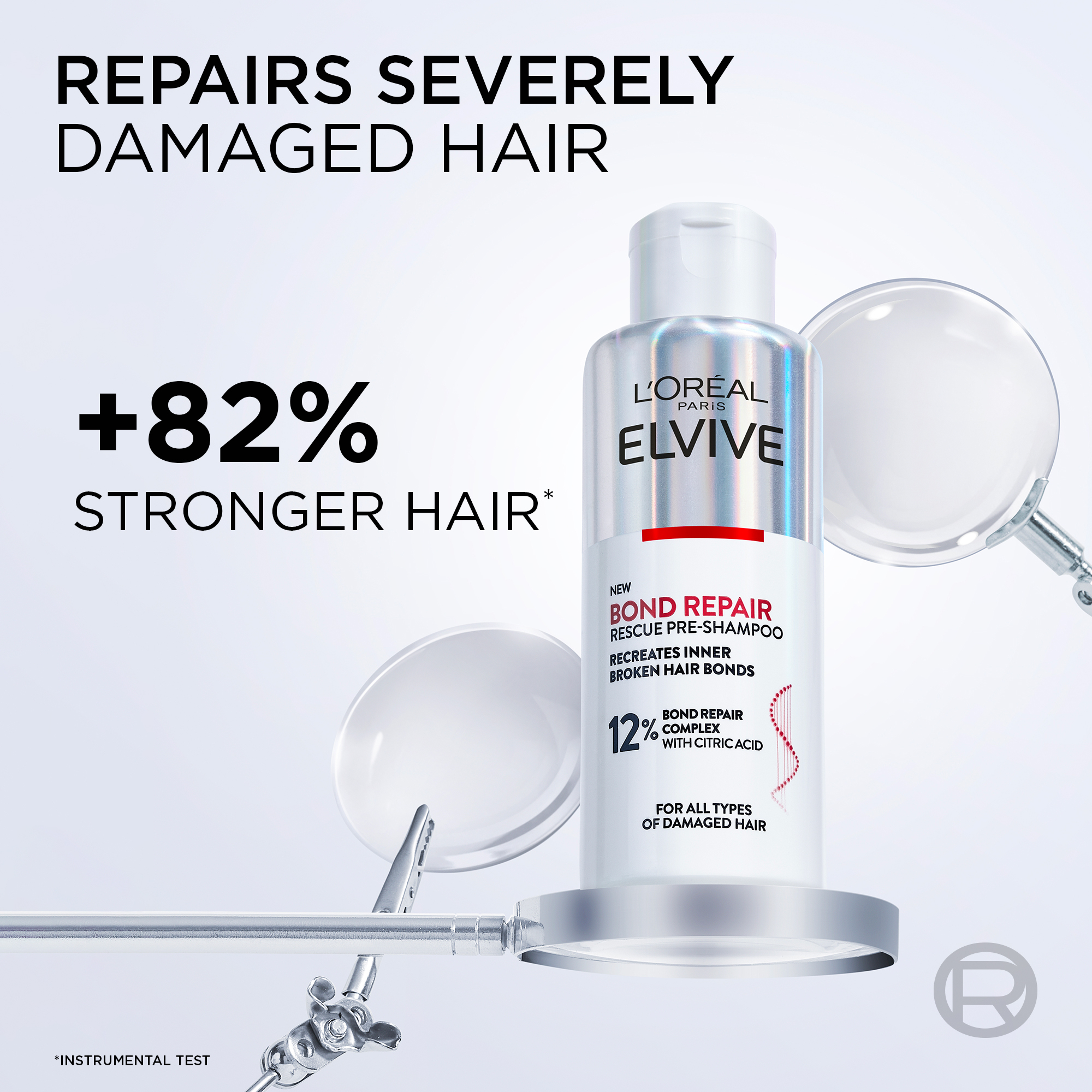L'Oréal Paris Elvive Bond Repair Pre-Shampoo is an intensive rinse-off treatment to use before shampoo to help overcome weak and damaged hair. Our formula is powered by 12% Bond Repair complex with citric acid to go beneath the hair surface to reinforce broken hair bonds for +98% stronger hair*. *Instrumental test on Pre-Shampoo + Shampoo + Conditioner