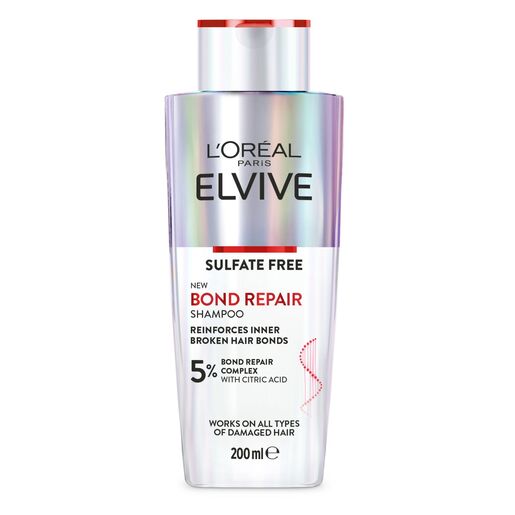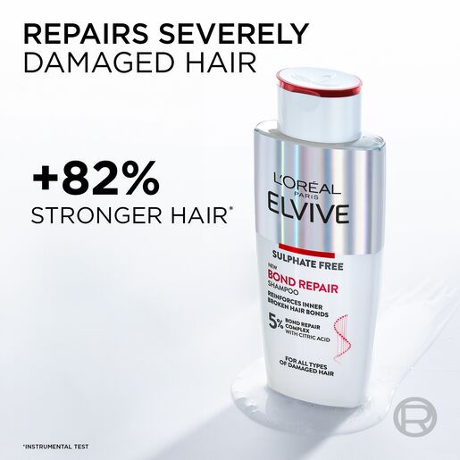 L'Oréal Paris Elvive Bond Repair Shampoo is powered by 5% Bond Repair complex with Citric Acid to penetrate beneath the hair surface, helping to reinforce broken hair bonds while cleansing.