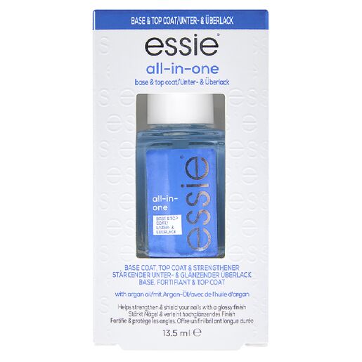 essie All In One is a nail polish base coat and top coat in the product. This multi-use product helps strengthen and smooth nails as base cpat before nail polish whilst also being a glossy top coat for the perfect high shine finish that lasts for days. essie brings you all your favourite shades, from versatile neutrals to show-stopping icons. With a formula and a brush that takes advantage of the very best salon-professional technology.