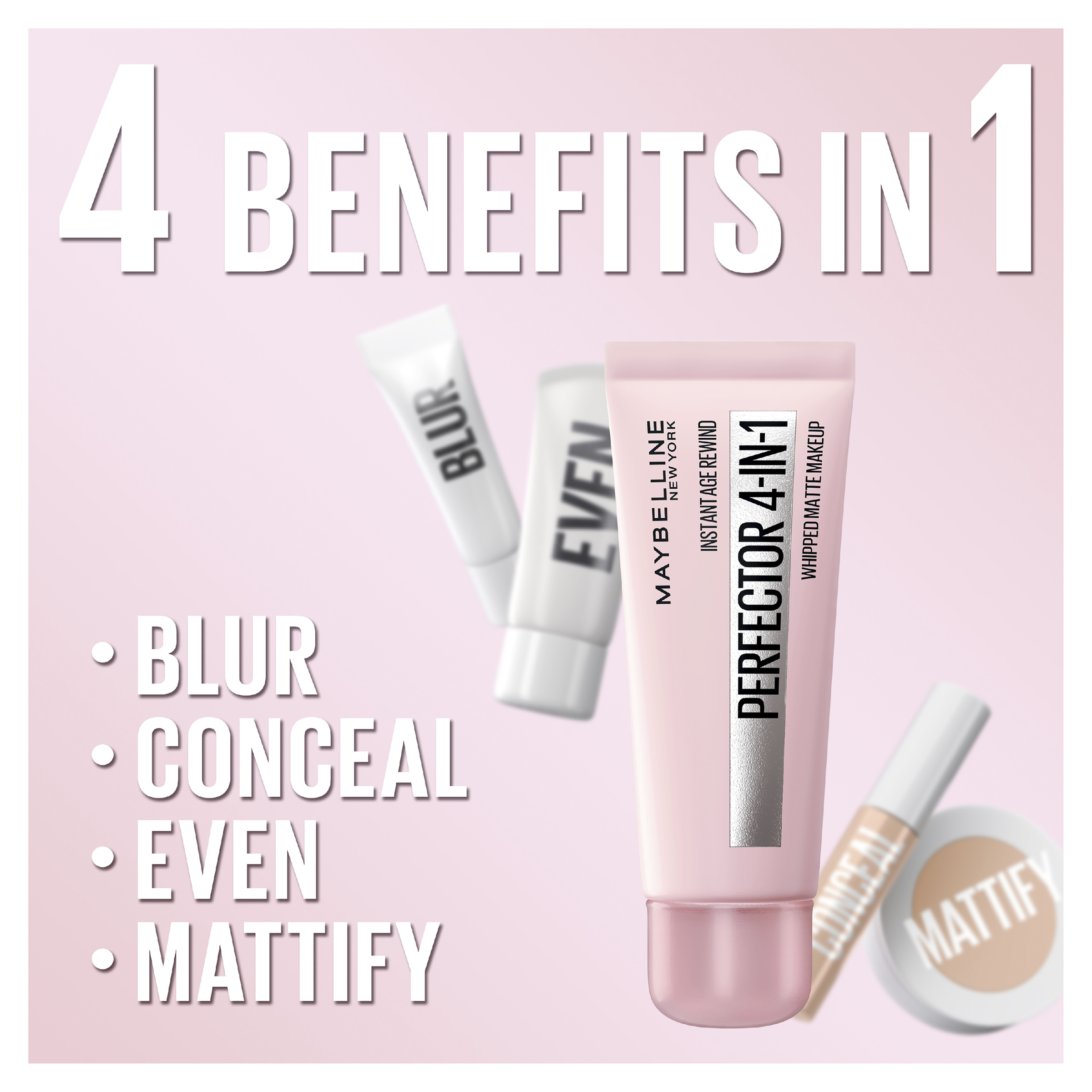 Introducing Maybelline's Instant Age Rewind Instant Perfector 4-In-1 Matte Makeup which has a whipped, lightweight texture that blurs pores, conceals blemishes, mattifies and evens skin tone—all in one easy step!
