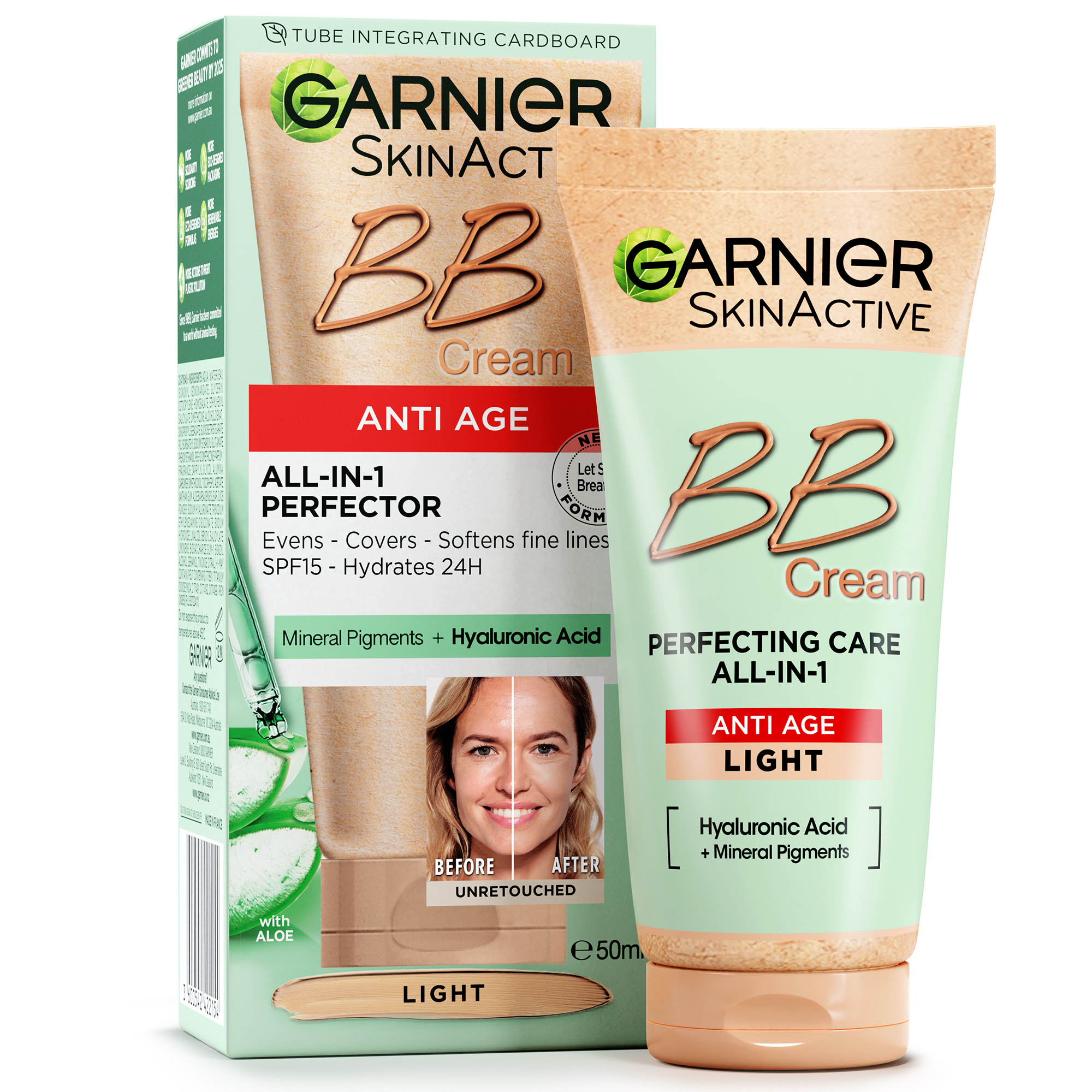 Garnier BB Cream Anti-Age provides the benefits of using a foundation, a hydrating care and an SPF 25 all in one single step offering natural looking coverage in a caring formula. Instantly even skin complexion, corrects the signs of fatigue, gives a luminous glow and protects the skin from UV rays with SPF 25. This all-in-1 convenient beauty solution features a new let skin breathe lightweight and blendable formula. Enriched with Hyaluronic Acid for all day long hydration, Aloe Vera for its comforting properties, and ultra fine mineral pigments for a radiant finish. Garnier BB Cream is non-comedogenic and dermatologically tested. Now in an innovative, more sustainable integrated cardboard tube made with 49% less plastic and 100% recyclable cardboard box that is responsibly sourced. Garnier BB Cream Anti-Age is available in two shades: Light and Medium.