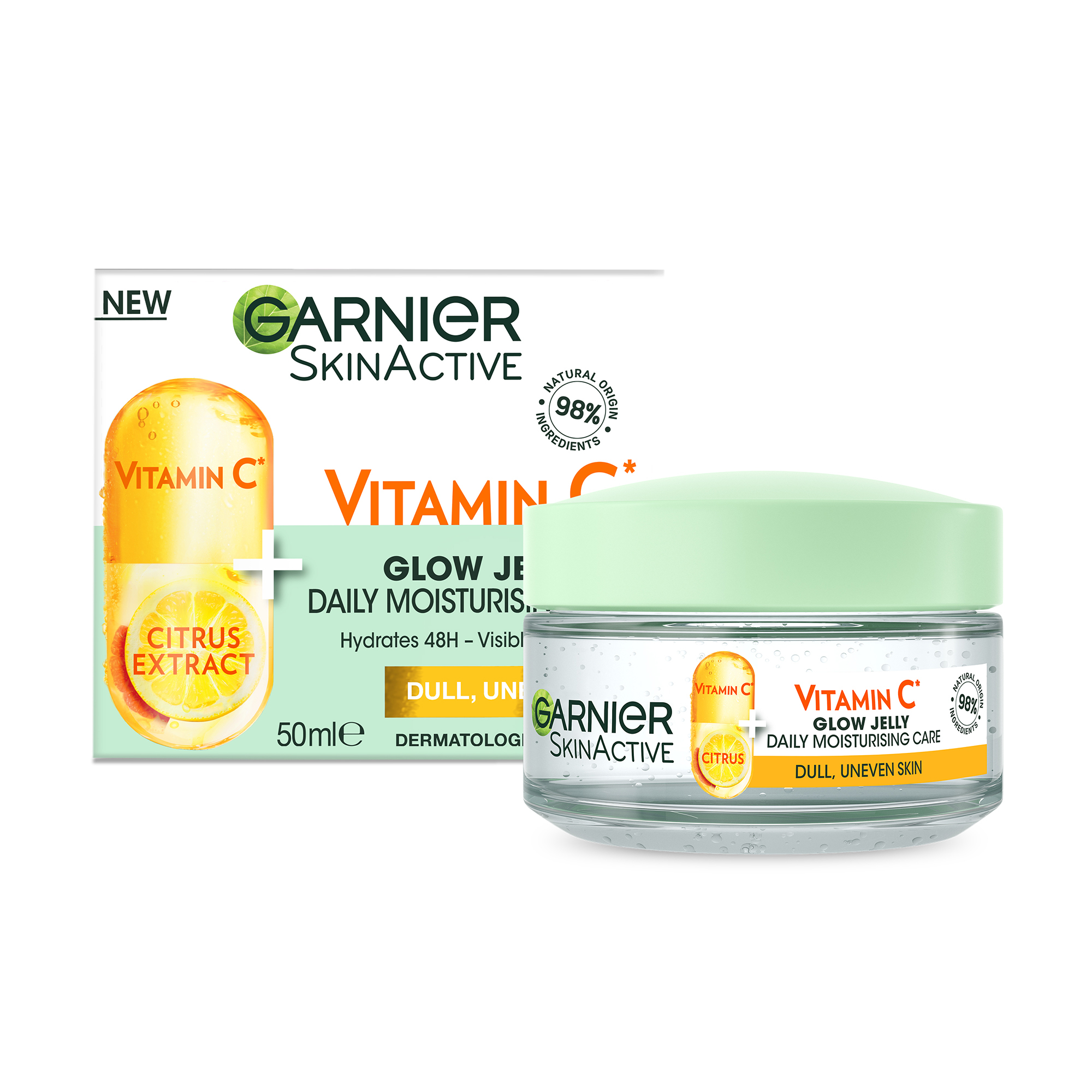 Our moisturising glow jelly with 98% natural origin ingredients is enriched with Vitamin C* and super citrus extract to leave your skin visibly brightened and your skin complexion appears more fresh. *Vitamin Cg