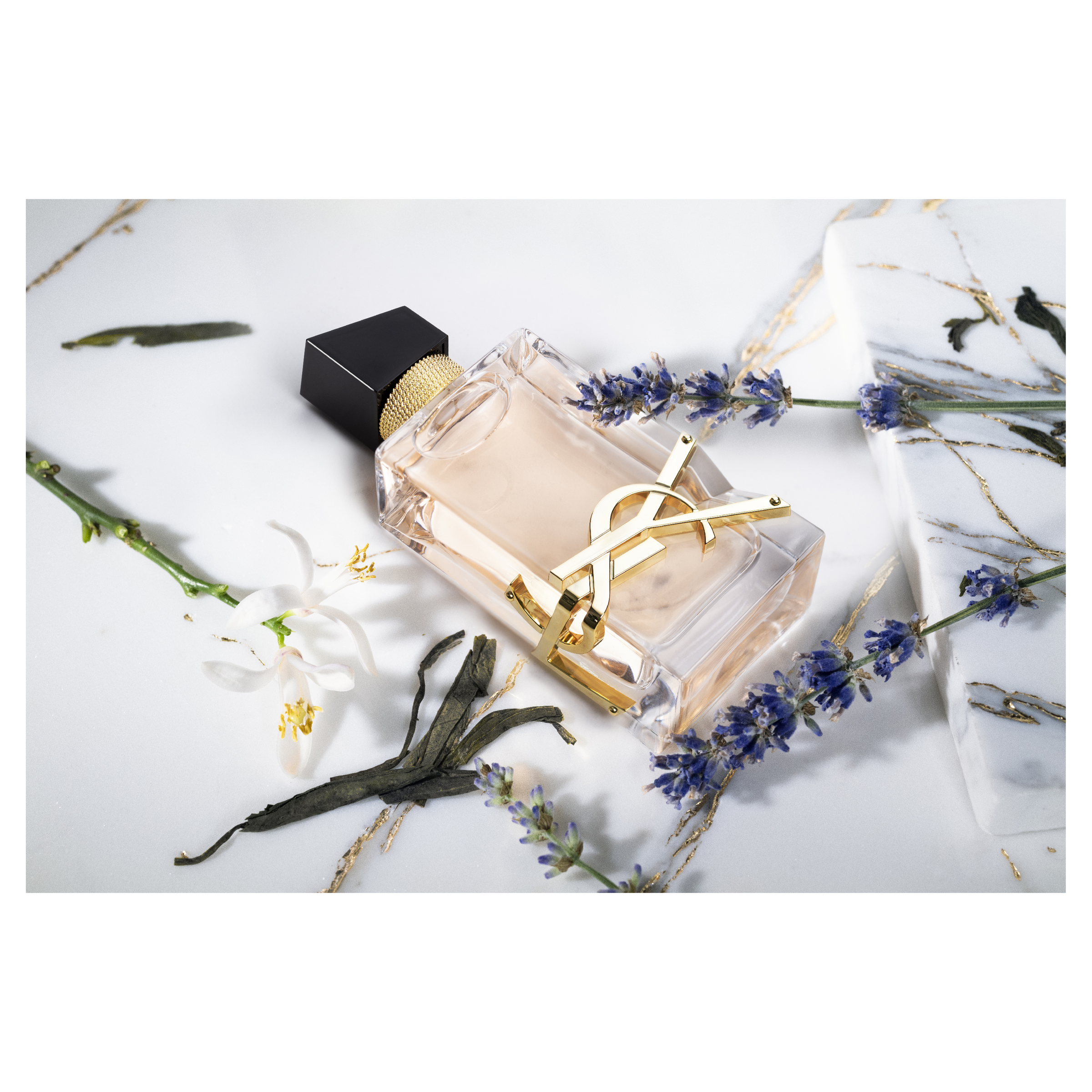 Experience a new bare freedom. Libre Eau de Toilette the hottest must-have fragrance by Yves Saint Laurent. The perfume of a sensual and irrevent woman, stretching the frontiers of her feminity. Her heart burns of desire. Her skin shivers in tension. A new intimate olfactive tension. The burning sensuality of orange blossom absolute meets the aromatic freshness diva heart lavendar in limpid infusion of white tea accord. First note of orange flower absolute is hand-harvested from Morocco and elaborated to retain only the most opulent fractions of the absolute. Diva lavender heart flowers from France are hand-harvested and then steam-distilled to retain only 100% natural essential oil. White tea accord a non-gendered ingredient whose freshness sublimates the diva lavender heart of the fougere accord Vanilla burbon essence is extracted from madagascar through the jungle essence technology capturing its richest aroma. The bottle of the season. Luxury packaging in edgy trends. A delicate golden pink fragrance shade, celebreating feminity on the edge of nude. A vertical elongated bottle with the horizontal oversized cassandre embodying undressed freedom statement. Undress your freedom with Libre Eau de Toilette.