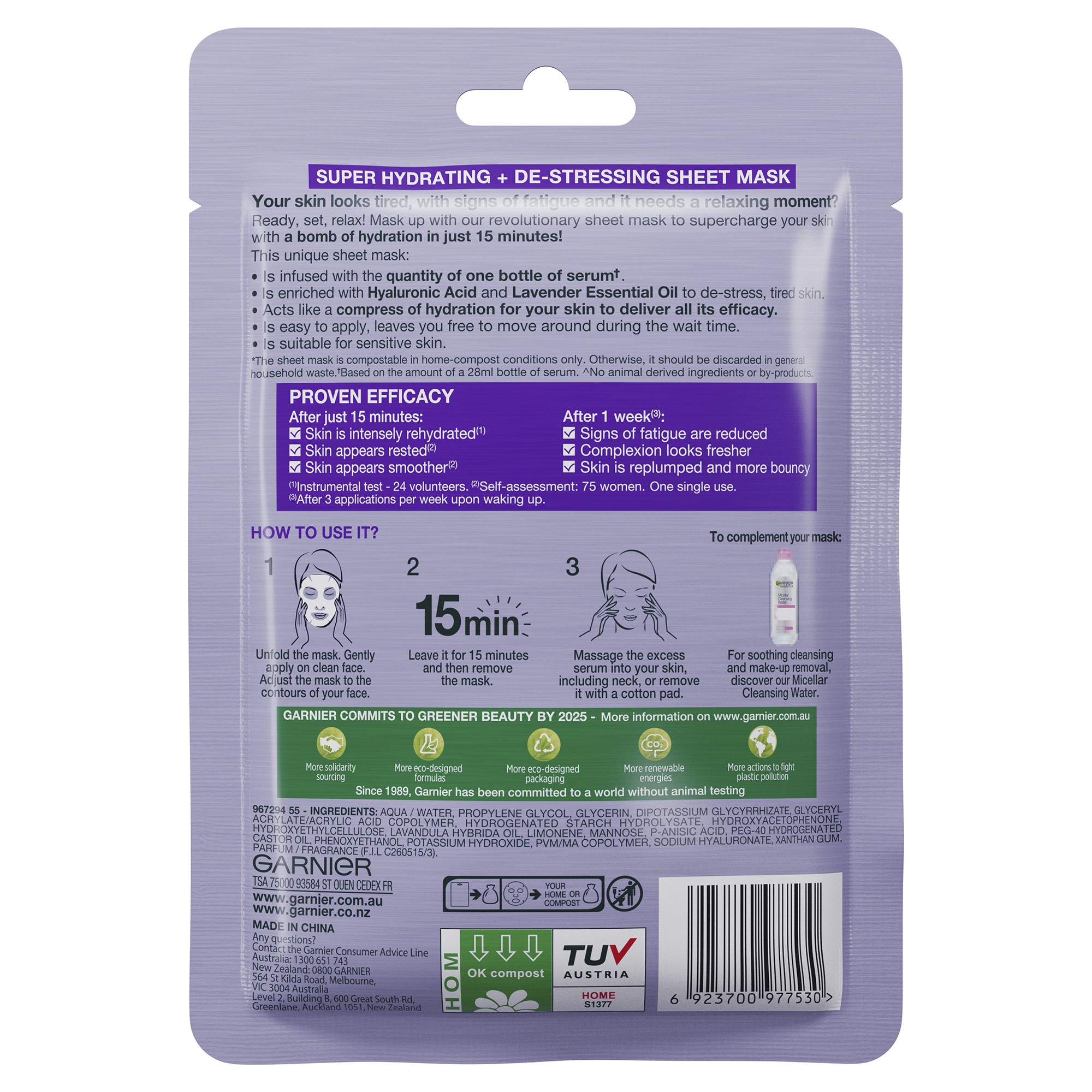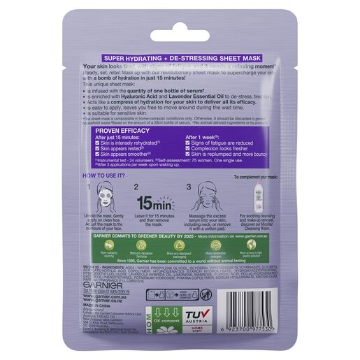 Super hydrating and de-stressing sheet mask, enriched with Hyaluronic Acid + Lavender to rejuvenate tired skin.