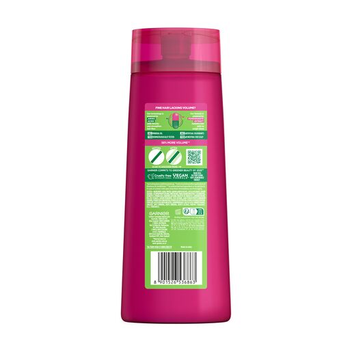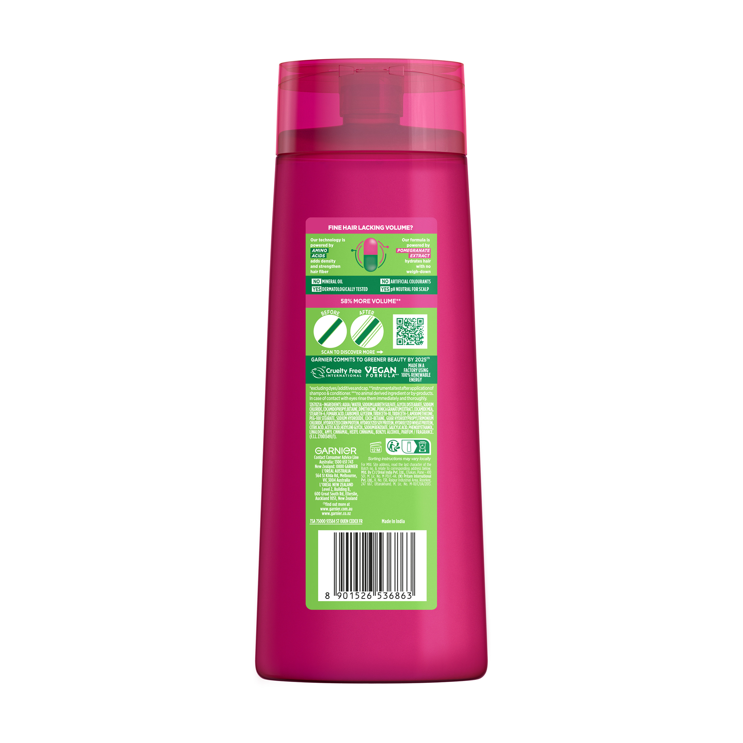 Garnier Fructis Full & Luscious Shampoo combines natural pomegranate extract with a breakthrough, fibre-filling molecule that penetrates deep into the hair fibre and then expands, creating lasting thickness with a weightless finish RESULT: Hair is beautifully thicker*, fuller, healthier and stronger. *Instrumental test: shampoo + conditioner after 5 applications. All Garnier products are officially approved by Cruelty Free International. Since 1989, Garnier has been committed to a world without animal testing.