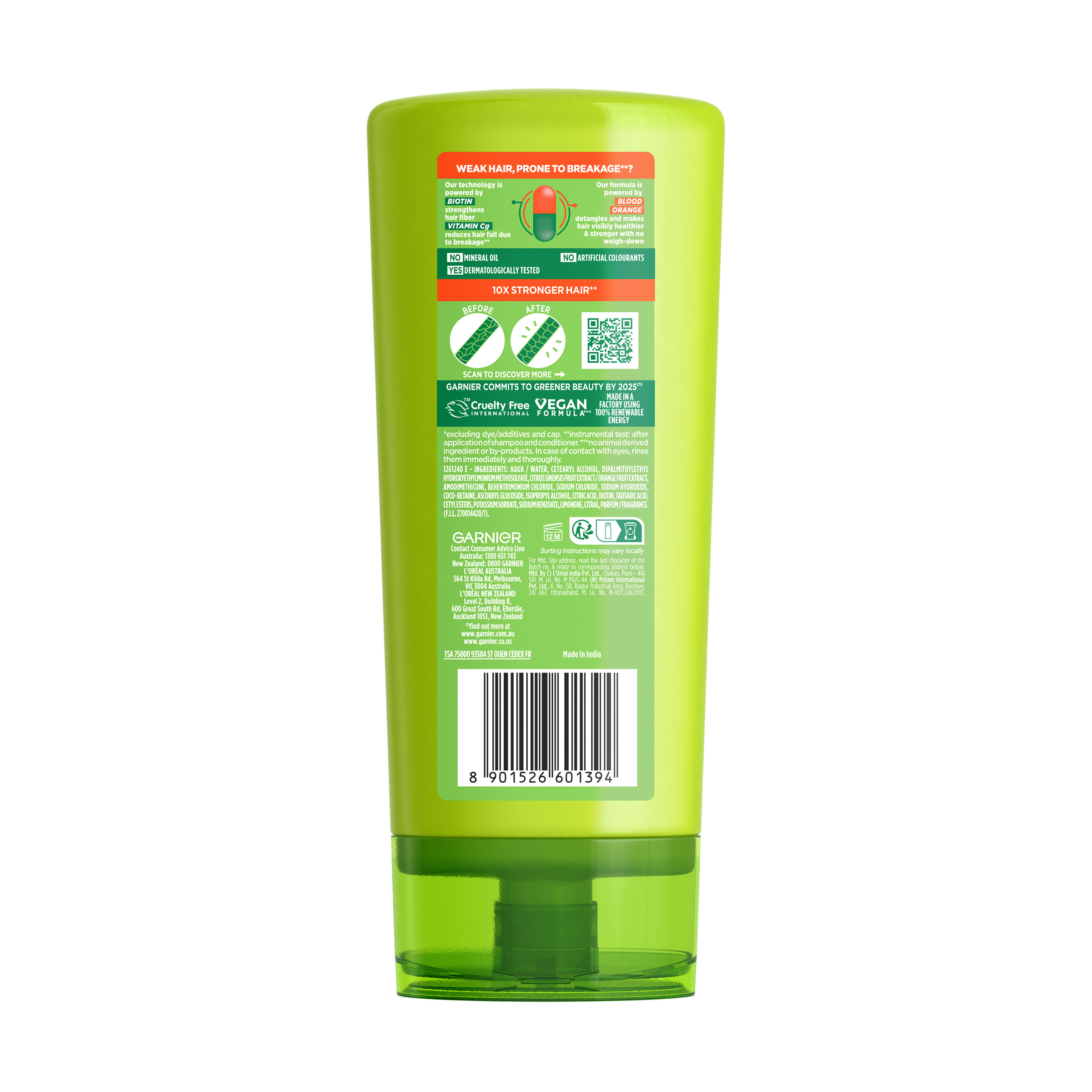 WEAK HAIR, PRONE TO BREAKAGE? Discover your daily dose of vitamin-enriched conditioner for 10x stronger* hair from roots to tips and reduce hair-fall due to breakage. Our conditioner is powered by a super duo of ingredients, a natural origin superfruit andpowerful scientific actives: • Blood orange, one of the fruit the mostconcentrated in vitamins, to fortify hair fiber; • A multivitamins complex, Vitamin C derivative and Biotin, to strengthen hair from roots to tips. It’s proven! Hair is visibly healthier and stronger. Vitamin & Strength conditioner is: VEGAN FORMULA** DERMATOLOGICALLY TESTED PH NEUTRAL FOR THE SCALP MORE SUSTAINABLE PACKAGING: Garnier fructis shampoo & conditioner bottles are made from 100% recycled plastic^ and can be recycled. GARNIER COMMITS TO GREENER BEAUTY BY 2025: More solidarity sourcing Greener Science & Formulas More recycled & recyclable packaging More renewable engery Garnier is approved by Crueltry Free international under the Leaping Bunny Programme *instrumental test, shampoo + conditioner. **no animal derived ingredients ^except label, additives and cap.