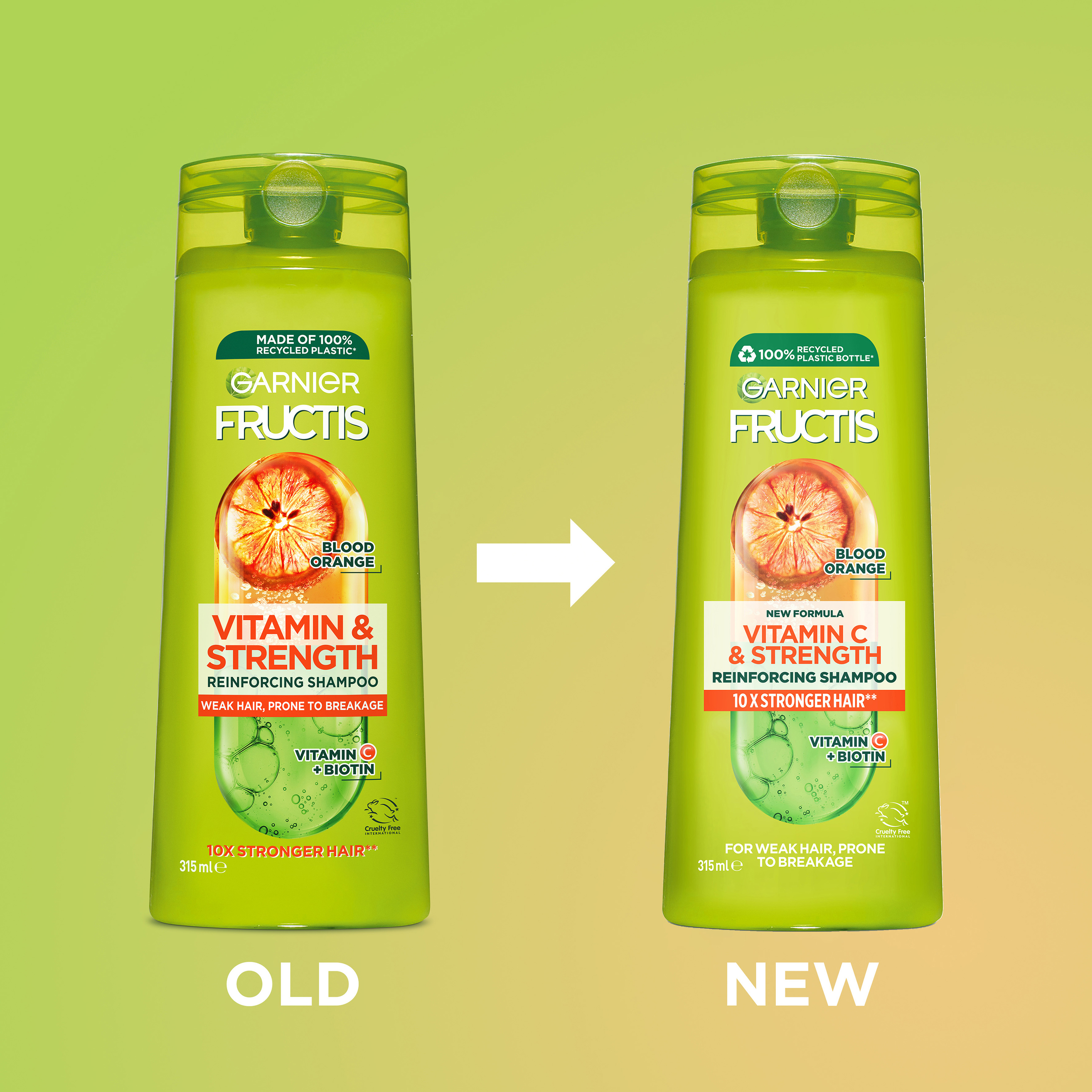 WEAK HAIR, PRONE TO BREAKAGE? Discover your daily dose of vitamin-enriched shampoo for 10x stronger* hair from roots to tips and reduce hair-fall due to breakage. Our shampoo is powered by a super duo of ingredients, a natural origin superfruit and powerful scientific actives: • Blood orange, one of the fruit the mostconcentrated in vitamins, to fortify hair fiber; • A multivitamins complex, Vitamin C derivative and Biotin, to strengthen hair from roots to tips. It’s proven! Hair is visibly healthier and stronger. Vitamin & Strength Shampoo is: VEGAN FORMULA** DERMATOLOGICALLY TESTED PH NEUTRAL FOR THE SCALP MORE SUSTAINABLE PACKAGING: Garnier fructis shampoo & conditioner bottles are made from 100% recycled plastic^ and can be recycled. GARNIER COMMITS TO GREENER BEAUTY BY 2025: More solidarity sourcing Greener Science & Formulas More recycled & recyclable packaging More renewable engery Garnier is approved by Crueltry Free international under the Leaping Bunny Programme *instrumental test, shampoo + conditioner. **no animal derived ingredients ^except label, additives and cap.