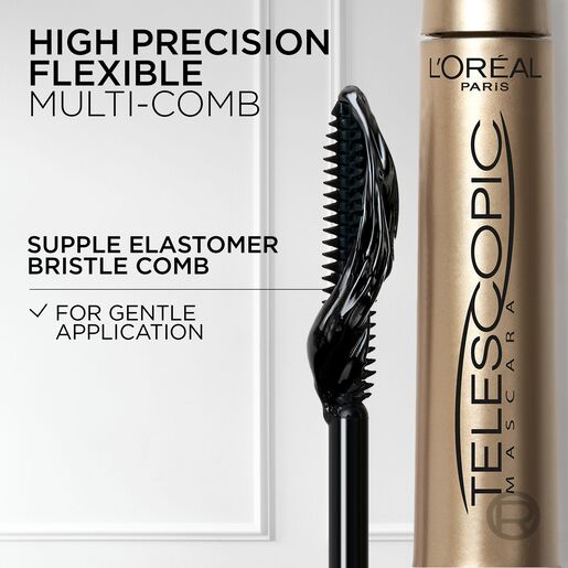 Up to 70% longer looking lashes* and intensity lash by lash. L’Oréal Paris Telescopic Clean Definition Mascara delivers cleanly defined, well separated lashes. The flexible brush separates and coats your lashes one by one for extreme length and definition. Telescopic length and precise separation for your eyes only! *Instrumental test, 27 subjects, after 30 passages of the mascara